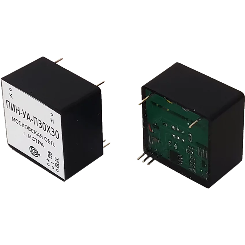 Преобразователи напряжения измерительные ПИН-УА предназначены для преобразования напряжения постоянного и переменного токов в цепях, гальванически изолированных от питания и выхода. ПИН-_-УА-П30х30 преобразуют мгновенные значения измеряемого напряжения постоянного и переменного тока в пропорциональные значения силы постоянного и переменного тока. Литера «П» в названии означает, что преобразователь предназначен для монтажа на печатную плату.